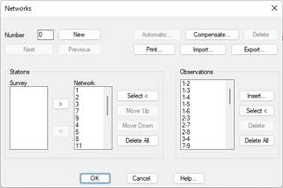 In addition to traverses, complex observation networks can also be adjusted Access to this command is through the Surveying > Networks option, or by clicking the Networks button in the Station Calculation window.