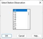 Station selection is the same as with the traverses. The selection of observations, on the other hand, can be done from a list of observations between stations, accessed by pressing the Insert button, or by graphically selecting previously drawn observations.