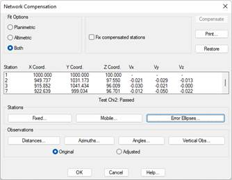 Clicking the Compensate button provides access to the network adjustment window, as long as there are at least two fixed stations. The way this window works is very similar to the Traverses window.
