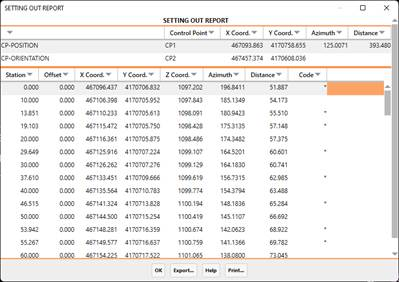 For each interval from the initial station to the final station, it displays the station, offset, X, Y and Z coordinates, azimuth and distance from the base and reference control points, and code. The latter will be an asterisk (*) for critical sections. The Z Coordinate is obtained from the segment, should it be defined.