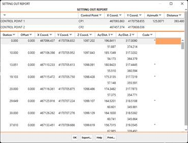 For each interval from the initial station to the final station, it displays the station, offset, X, Y and Z coordinates, azimuth and distance from the control point, and code. The latter will be an asterisk (*) for critical sections. The Z Coordinate is obtained from the segment file, should it be defined.