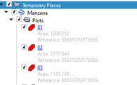 The elements created with the commands Utilities > Plots are exported individually. Each one of these is individually listed on the left-hand panel of Google Earth, in the folder Plot, including associated details on the Area, and whether an Owner or Reference exist.