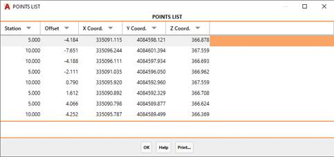 After finishing the execution of the command, a list of all points calculated will be shown.