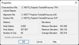This option will allow us to visualize the characteristics of a drawn cross section. Additionally, we have the possibility to indicate if the selected cross sections will be updated automatically in the case of modifying the surface or alignment from which they were generated.