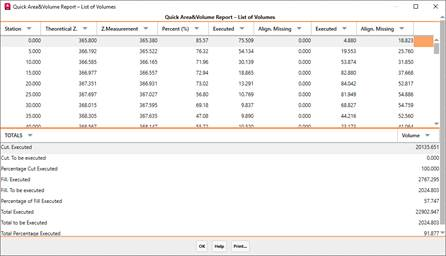 All these values are indicated for cut and fill. The end of the list displays the amount of square or cubic (volume) units executed and pending, along with the survey percentage completed.