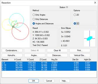 This option allows one to calculate stations that have target at least three known coordinate points. Its use is very similar to the Direct Intersection command. It can be accessed through the Surveying > Utilities > Inverse Intersection drop-down menu or by clicking the Resection button from the Station Calculationscreen. In the former case, it requests an occupation point to be selected: