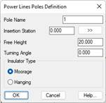 We first need to have drawn the long section on which the power lines are to be drawn; we then execute this command and we will be asked for the drawn profile and the file in which the power line parameters are to be stored. The following window will then appear into which we insert the different parameters.