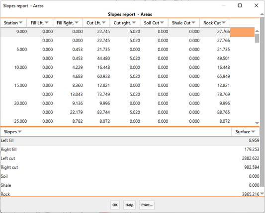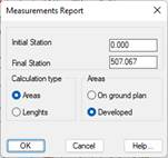 As with the previous command, in these cases we can generate a list of the length of the slopes or the area of the same. When selecting areas, the list may consist of developed or ground plan areas in the cut and fill slopes of the road of the segment selected.
