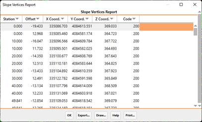 Executing this command creates a list of all the vertices corresponding to the distinct slope vectors that comprise the section in each station.