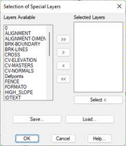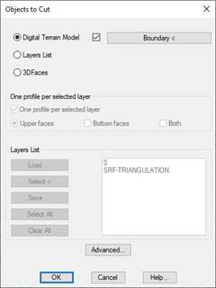 Layers List: This option allows one to cut any drawing element with elevation. In order to do so, the relevant layers whose elements are represented in 3D are selected using the cursor. The digital model can also be included in the selection by marking the TRI layer. Activating this option enables the Layers List box, from which the layers containing the 3D information can be selected.