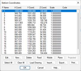 Clicking the Load Drawing button captures all the station information represented in the original drawing. A station file can also be added using the Import button. Additionally, the Export button can save the information to a station file. Lastly, Print generates a station coordinates list with the following format: