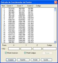 Este comando tiene por objeto facilitar la entrada manual masiva de datos de coordenadas de puntos. Se muestra un diálogo con los puntos existentes en el levantamiento, y puede comenzar a introducirse los datos en las casillas X, Y, Z y Código. Si no se desean introducir los códigos debe desactivarse la casilla Pedir Códigos. Los puntos se numeran automáticamente a partir del último.