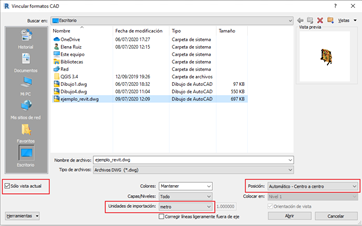 ![]() En las opciones de vinculación del formato CAD, hay que marcar la casilla “Sólo vista actual”, en Unidades de importación poner metros y en Posición poner “Automático – Centro a centro”.