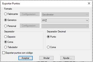 Para exportar esta nube de puntos a un fichero TXT o CSV en formato X, Y, Z separados por comas, utilizamos el comando MDT > Puntos > Exportar y a la hora de guardar el fichero le ponemos extensión TXT y deshabilitar la opción de Exportar puntos con código.
