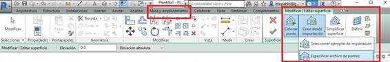 ![]() Una vez situado el proyecto en las coordenadas deseadas podremos obtener una superficie topográfica a partir de la importación de un fichero de puntos en formato TXT o CSV. Para ello nos dirigiremos a la pestaña Masa y Emplazamiento> Modelar emplazamiento > Superficie Topográfica: