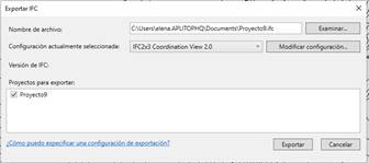 ![]() En el dialogo de exportación a IFC elegir el formato “IFC2X3 Coordination View 2.0” y generará el correspondiente fichero IFC: