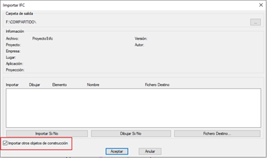 ![]() Volvemos a MDT y en MDT8.5 > BIM > Importar IFC, aparece el siguiente diálogo dondé deberemos activar la casilla “Importar otros objetos de construcción”, al darle aceptar vemos como dibuja la correspondiente superficie (normalemente en color blanco, cambiar el color de la capa para poder visualizarla) y en las coordenadas originales del DWG: