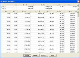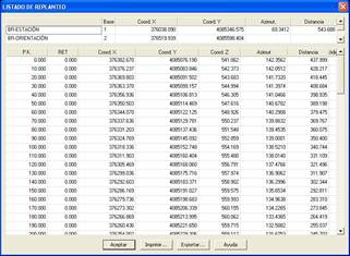 Método de Replanteo por Polares: Para cada intervalo desde el pk inicial y hasta el pk final se presentan el Pk, desplazamiento, coordenadas X,Y,Z, azimut y distancia con respecto a la base estación, y código, que será asterisco (*) en los puntos singulares. La coordenada Z se obtiene del segmento, en caso de estar definido.
