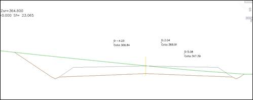 A continuación, se puede visualizar una captura de un dibujo de un corte determinado del perfil transversal donde aparece rotulado la distancia a eje y la cota en distintos puntos.