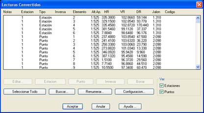 Revisar Lecturas. Se muestra un diálogo donde se pueden visualizar todas las lecturas convertidas, pudiendo decidir si son puntos o estaciones, editar sus valores y borrar las lecturas inválidas.