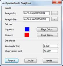 Parámetros relacionados con el comando Dibujar Anaglifos. Se pueden establecer los nombres de las capas donde se dibujan las curvas del anaglifo, así como los colores a utilizar. El parámetro Interpupilarrepresenta la separación entre los ojos del observador, y el parámetro Observaciónes la distancia desde la que se va a observar el anaglifo.