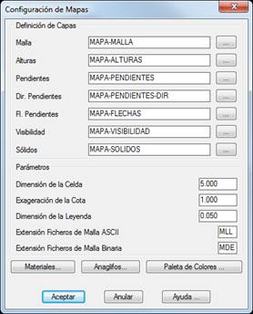 Muestra los parámetros de configuración para los comandos de dibujo de malla 3D, mapa de pendientes y mapa de alturas.