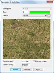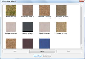 Establece los materiales a utilizar por los diferentes comando que se encuentran en el submenú Mapas/Realismo. Consultar el Manual de Referencia para más información.