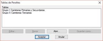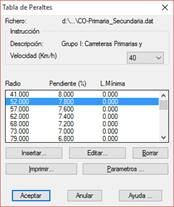 Existe la posibilidad de insertar, editar y borrar las tablas de peraltes existentes.
