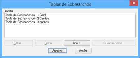 Abrir: Nos permitirá incorporar una nueva tabla de sobreanchos que tengamos en otra ubicación.