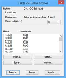 Desde este apartado podremos modificar, insertar o eliminar las distintas tablas de sobreanchos disponibles según la normativa del país seleccionado.