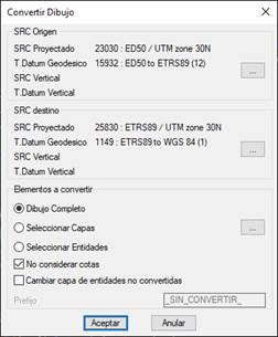 Este comando permite convertir un dibujo completo de un SRC origen a otro SRC destino. Tras invocar el comando se muestra el siguiente diálogo: