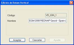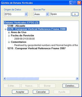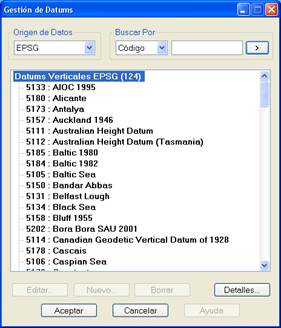 Muestra el listado de datums verticales incluidos en la base de datos EPSG. También permite editar, borrar y crear nuevos datums verticales de usuario.