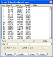 Este comando tiene por objeto facilitar la entrada manual masiva de datos de coordenadas de puntos. Se muestra un diálogo con los puntos existentes en el levantamiento, y puede comenzar a introducirse los datos en las casillas X, Y, Z y Código. Si no se desean introducir los códigos debe desactivarse la casilla Pedir Códigos. Los puntos se numeran automáticamente a partir del último.