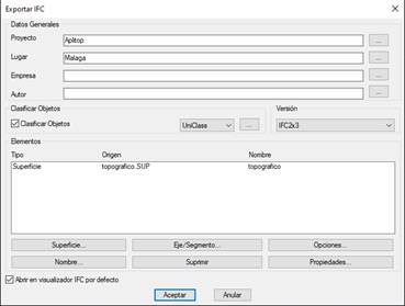 Para ello en primer lugar seleccionamos la superficie actual, y seguidamente ejecutamos el comando MDT > BIM> Exportar IFC. Seleccionamos en el recuadro Versión el formato IFC2x3, pinchamos sobre el botón Superficie, seleccionamos el fichero a exportar, aceptamos y a continuación el nombre del fichero IFC a crear.