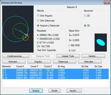Si se han activado los tests de bondad en la opción de Mínimos Cuadrados, dentro de la configuración de topografía, se mostrará en el marco Resultados si se ha superado o no el test Chi-Cuadrado. Además, en los listados de observaciones de acimut, angulares, de distancia y verticales, se añade una columna con el nivel de fiabilidad resultante del test de Baarda. En este caso los valores pueden ser: perfecta, buena, débil, mala o incorrecta.