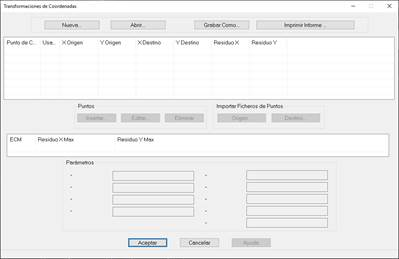 Para crear una nueva transformación se debe pulsar el botón Nueva…. De igual modo se puede cargar una ya existente pulsando la opción Abrir…. En este caso, también es posible cargar ficheros, con extensión TRF, de versiones anteriores de TcpMDT. Con este tipo de ficheros sólo se muestran los parámetros de transformación.