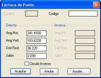 La información que se presenta para cada lectura de punto depende de la configuración establecida para la entrada de datos, pero siempre está definida por su Número de punto, que no es editable, las lecturas Directa e Inversa, y su Código. La casilla Círculo Inverso cuando se activa permite introducir los datos de la lectura inversa, en caso de existir.