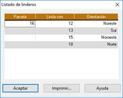 Muestra información sobre la orientación de la parcela con respecto a todas con las que linda en los cuatro puntos cardinales.