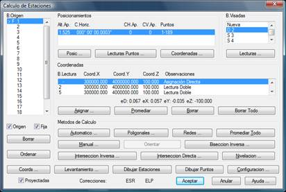 B.Origen. Permite seleccionar la base origen. Una vez seleccionada se indican en el diálogo los posicionamientos sobre esta base, las estaciones y puntos leídos, así como las coordenadas calculadas.