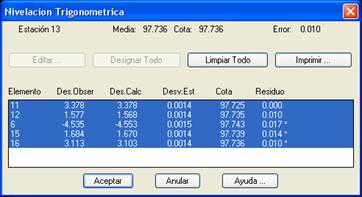 Se presentan todas las observaciones verticales obtenidas a partir de la información de lecturas, en forma de desnivel, y a continuación los resultados de cota definitiva y error máximo.