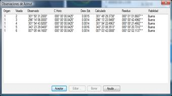 Las observaciones de acimut constan de estaciones origen y visada, azimut observado y calculado, desviación estándar, residuo y fiabilidad interna (perfecta, buena, débil, mala, incorrecta), e incluyen además la corrección horizontal de sus respectivos posicionamientos. Los valores angulares se expresan en grados centesimales o sexagesimales, dependiendo de la configuración elegida.