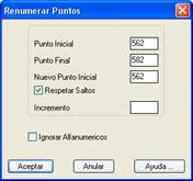 Renumerar. Este botón permite renumerar los puntos asociados a un posicionamiento, siempre que no se mezclen con los de otro. Aparecerá un diálogo que nos indica los puntos inicial y final, y nos pregunta el nuevo número del punto inicial (por defecto el mismo que tenía). También mediante una casilla de control podemos elegir si queremos o no Respetar Saltos que pudieran existir en la numeración original.