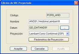 Muestra el listado de los SRC proyectados incluidos en la base de datos EPSG. También permite editar, borrar y crear nuevos SRC de usuario.