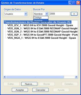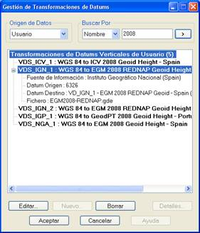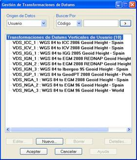 A diferencia de las opciones anteriores, en donde, por defecto, aparece el listado de elementos de la base de datos EPSG, se muestra sólo la lista de transformaciones de usuario. Estas transformaciones de datums están basadas en modelos de geoide con un formato propio. De ahí que no se soporte ninguna transformación propuesta por la OGP en su base de datos EPSG.