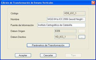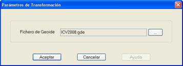 Parámetros de Transformación : Permite seleccionar el fichero de modelo de geoide en el que está basada la transformación de datums. Este fichero es binario y tiene extensión *.GDE.