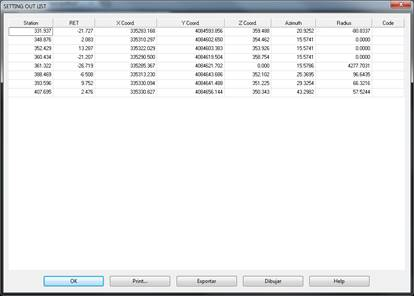 Firstly, the program asks whether we are going to designate the points graphically, the MDT points to be found on the drawing or they are going to be read from a file and secondly the alignment is requested, and a segment may be selected. The user then enters a series of points in the manner stated. After each of these operations, in the commands area it will present us with the relationship characteristics with regard to the alignment with station and offset, as well as their coordinates, azimuth and radius. In the event that any point cannot be projected onto the alignment, this will produce the corresponding error message.