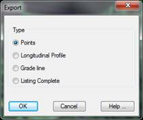 Points: The coordinates of all the points on the list are exported to a points file. When validating the dialogue, the command Export Points will be executed automatically. For further detail consult the Topographical Points section.