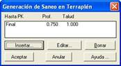 El objetivo de este comando es crear un saneo en el terreno natural en la zona de terraplén en función a una serie de parámetros. En primer lugar nos solicitará el segmento que deseamos modificar y a continuación nos aparecerá la siguiente ventana donde gestionaremos el tipo de saneo que deseamos aplicar.