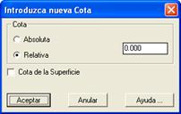 Este comando permite modificar las cotas de un conjunto de puntos. Tras seleccionar los puntos deseados, en la ventana de diálogo se puede elegir entre asignar una cota Absoluta a todos ellos, o bien desplazarlos verticalmente con la opción Relativa, introduciendo un valor con signo. En caso de que el dibujo tenga una superficie activa, también esta la posibilidad de asignar a los puntos la cota de la superficie en cada uno de ellos. Cuando un punto se ve modificado de esta ultima manera, no se asigna ni cota absoluta ni cota relativa.