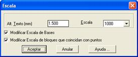 Este comando permite modificar el tamaño de los atributos: número, cota y código, de forma que estos se representen conforme a las características del dibujo. Se puede introducir directamente una altura de texto concreta, o bien si se modifica la escala el programa recalcula la altura de texto automáticamente.